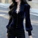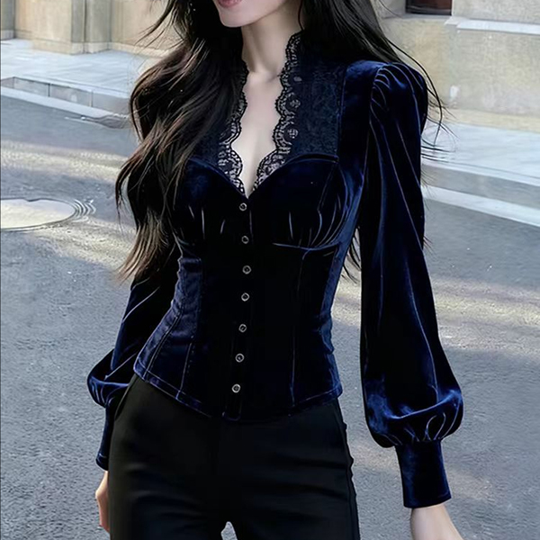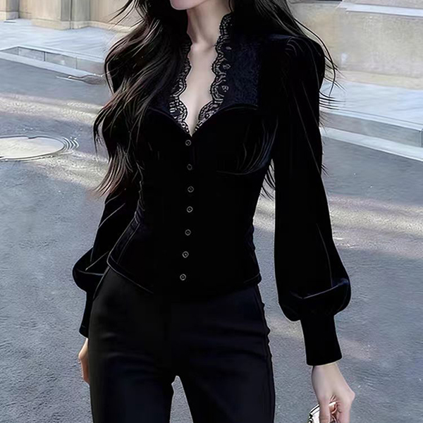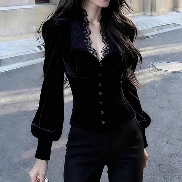 Fashion Lace Spliced V-neck Front Button Long Sleeve Velvet Shirt