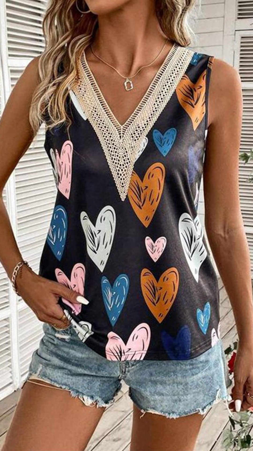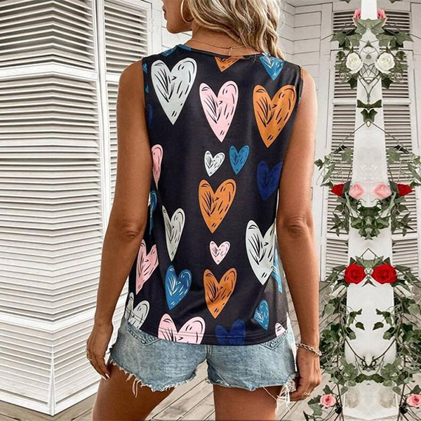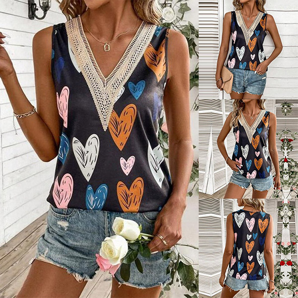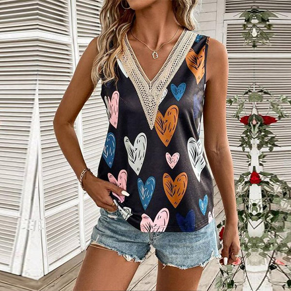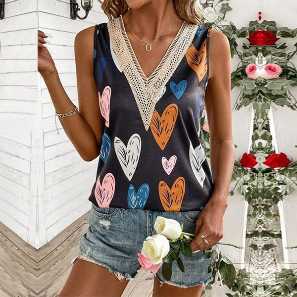 Fashion Lace Spliced V-neck Heart Printed Sleeveless Shirt