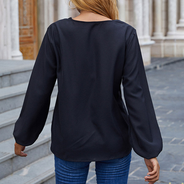 Fashion Lace Spliced V-neck Lantern Sleeve Solid Color Loose T-shirt