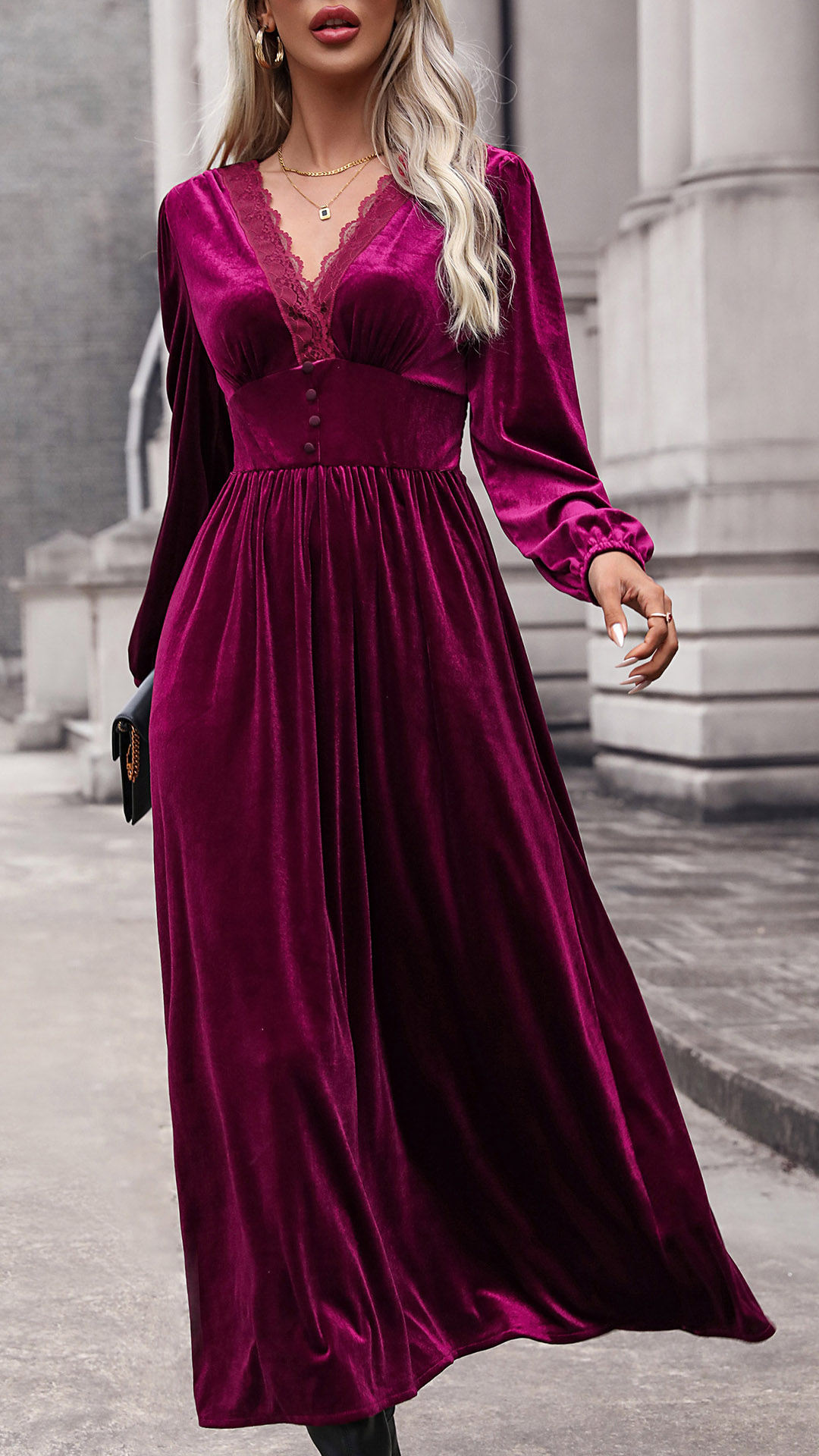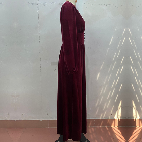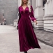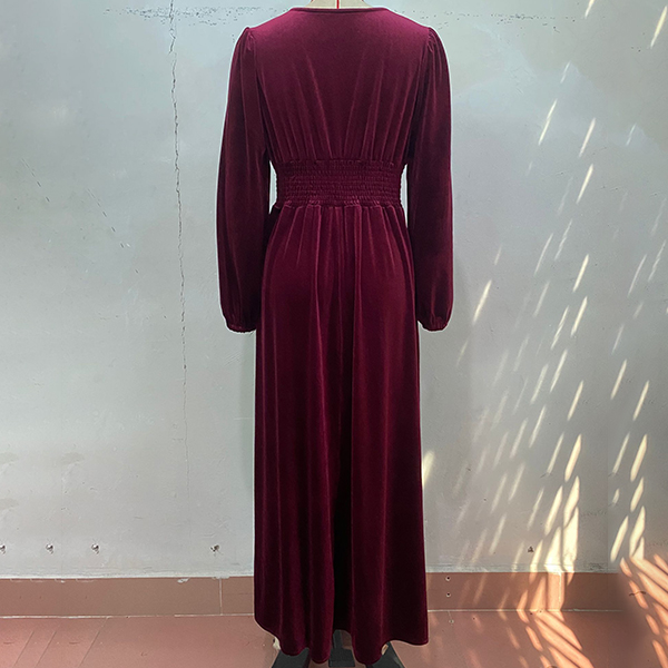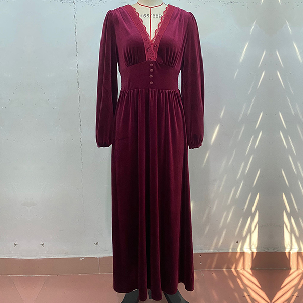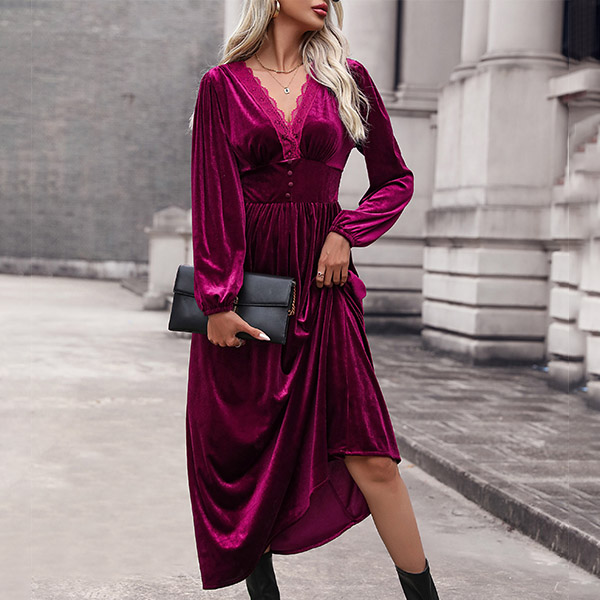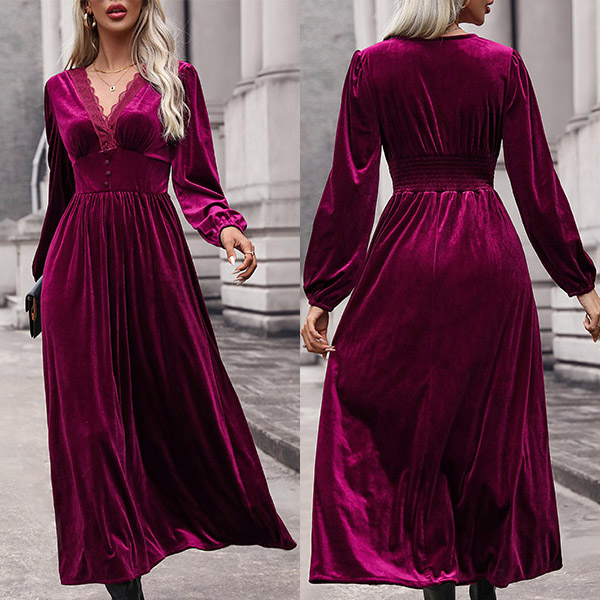 This midi dress features a V-neckline with delicate lace splicing, long sleeves for coverage and style, a cinched waist for a flattering silhouette, and a velvet fabric that adds a touch of opulence. Perfect for daily wear ~