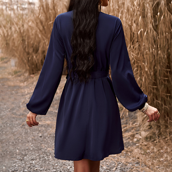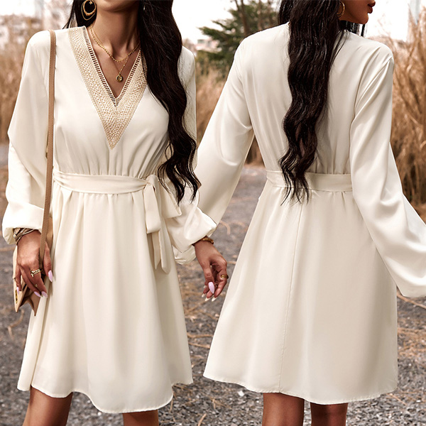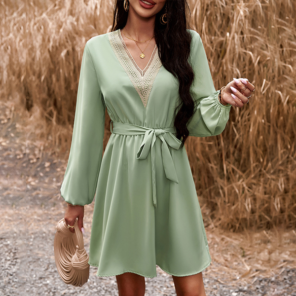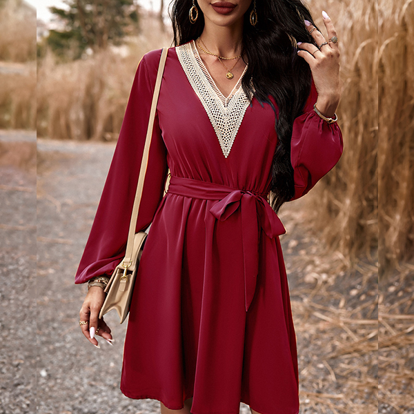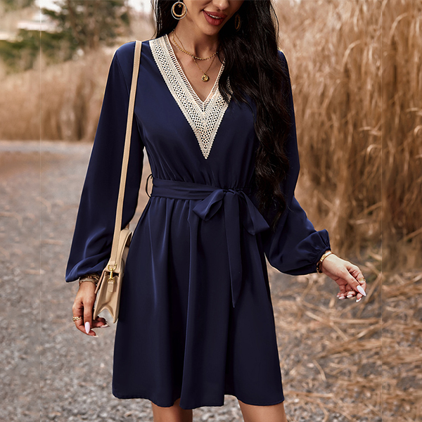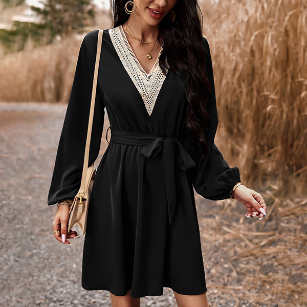 Fashion Lace Spliced V-neck Long Sleeve Drawstring Mini Dress