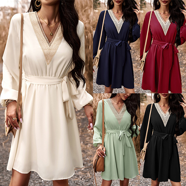 This dress features a lace spliced design along the V-neckline and long sleeves, combined with a drawstring waist for a flattering fit. Multi-color available.