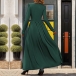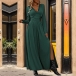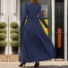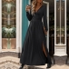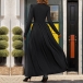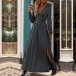 This captivating maxi dress seamlessly blends modern design elements with a touch of romantic lace along the V-neck, creating a striking and elegant look that is perfect for any formal occasion. Pair it with heels and statement jewelry for a formal evening event, or style it with flats and a denim jacket for a more casual, daytime look.