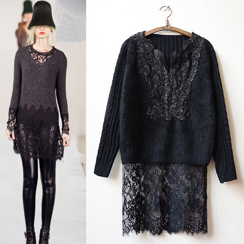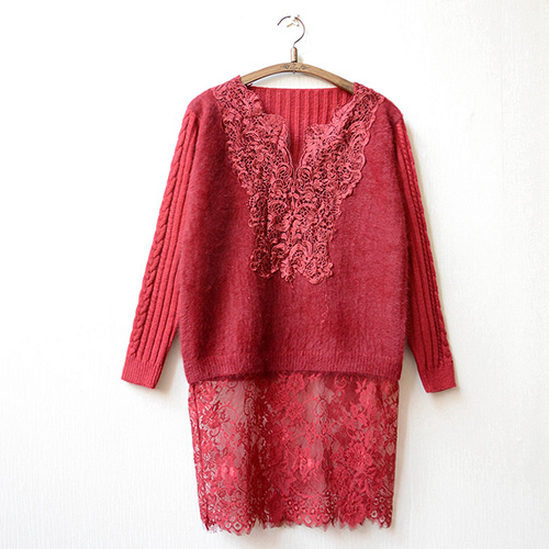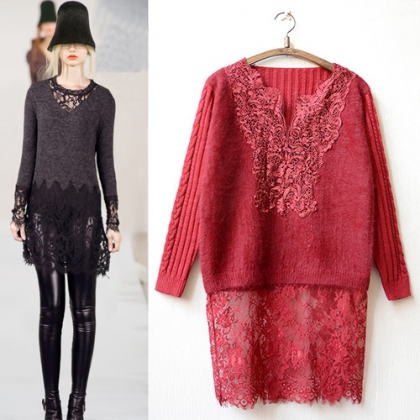 Fashion Lace Spliced V-neck Long Sleeve Knitted Dress