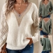 This sweater features a V-neck design with lace splicing, creating a delicate and romantic look. Pair it with jeans, skirts, or trousers for a chic and fashionable ensemble.