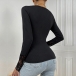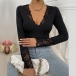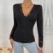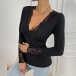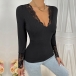 Fashion Lace Spliced V-neck Long Sleeve Ribbed Shirt