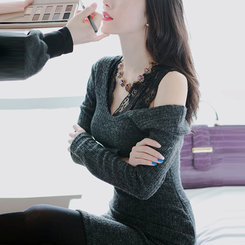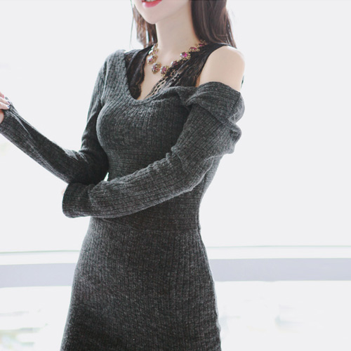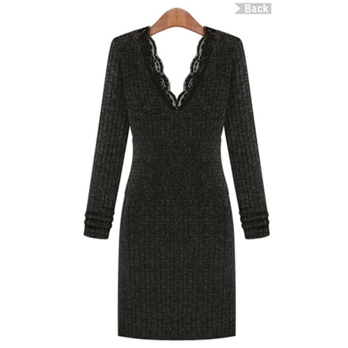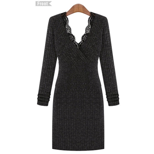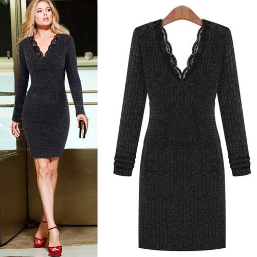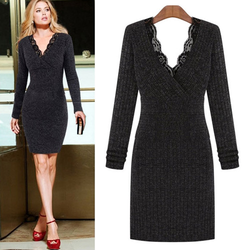 Fashion Lace Spliced V-neck Long Sleeve Slim Fit Knitted Dress