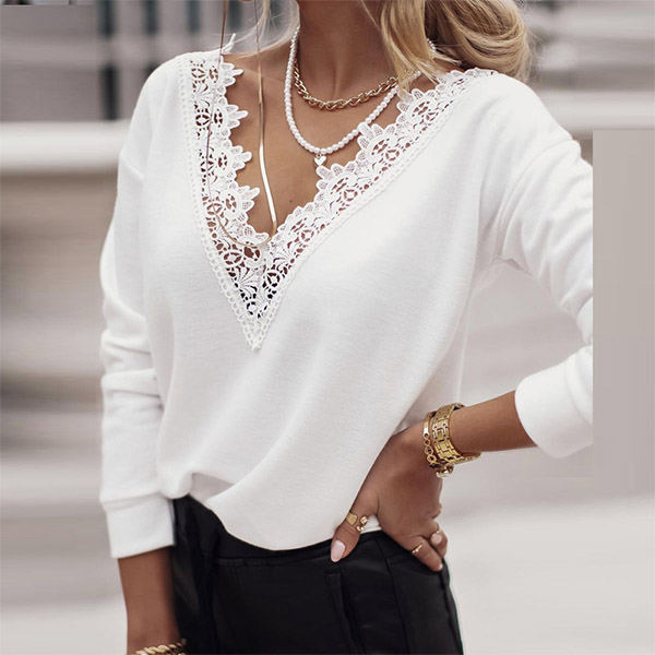 Fashion Lace Spliced V-neck Long Sleeve Solid Color T-shirt