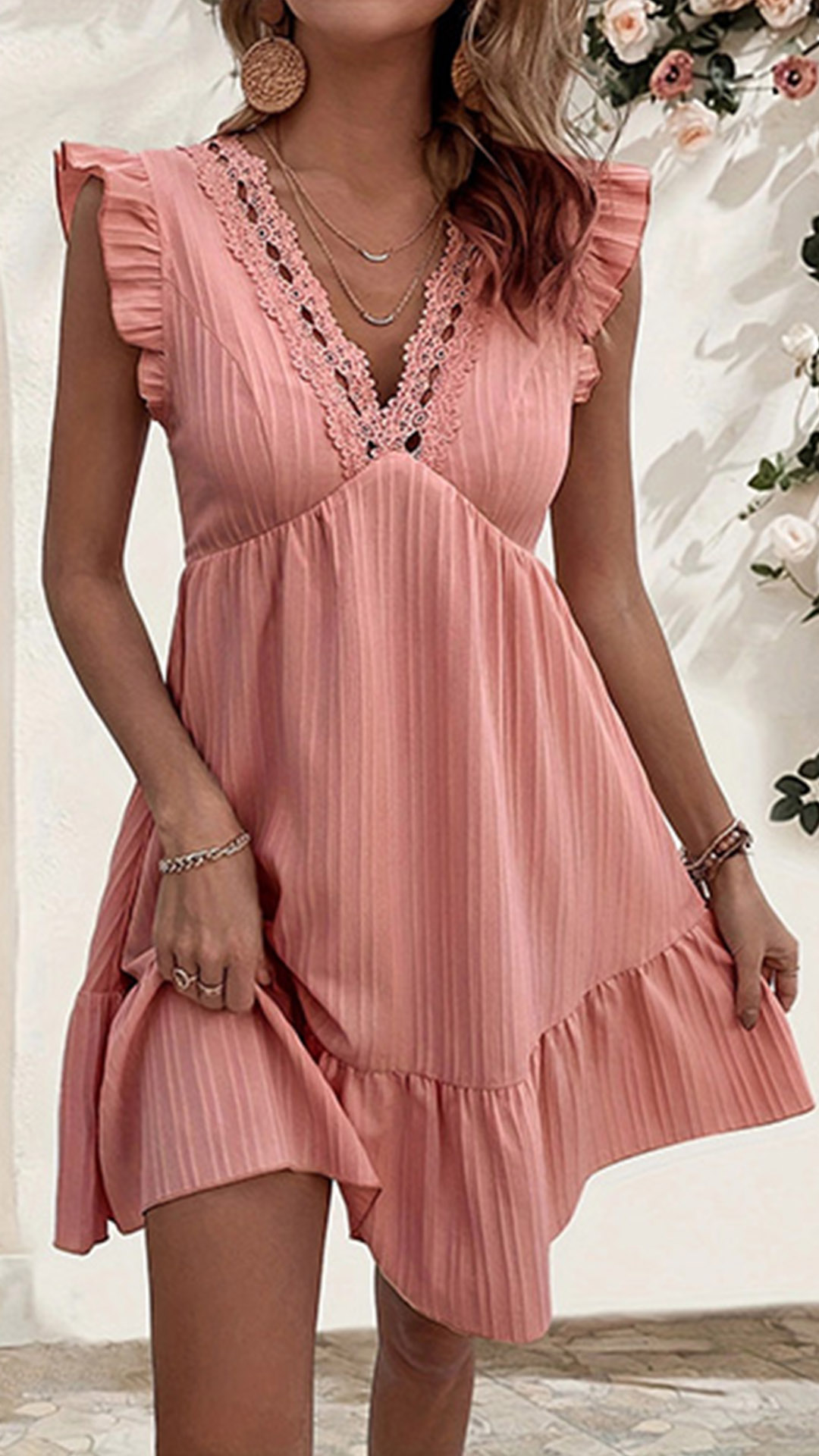 This captivating mini dress features lace splcied along the V-enck, sleeveless with ruffle details. Multi-colors avabile.