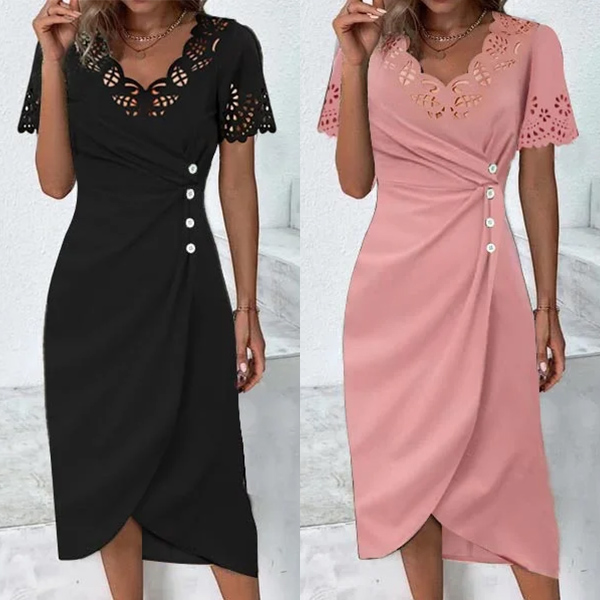 Look at this dress! The lace spliced detailing on the V-neck and short sleeve adds a delicate and romantic element, creating a visually stunning look. The button and ruched detailing adds a sophisticated and eye-catching element. Wanna have a try?