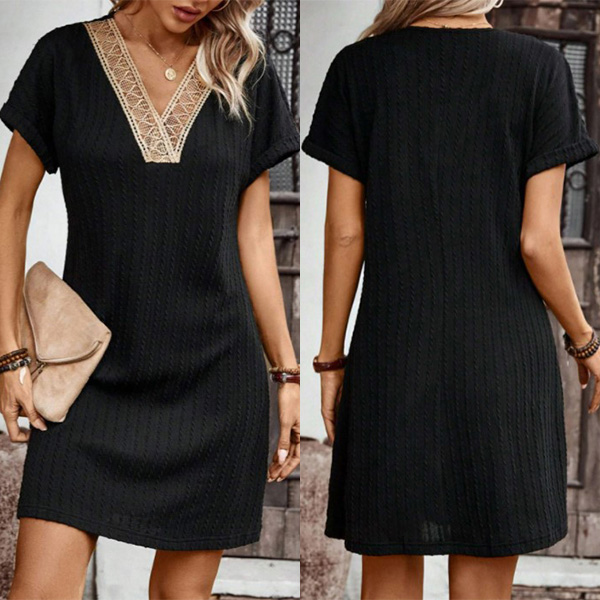 Fashion Lace Spliced V-neck Short Sleeve Mini Dress