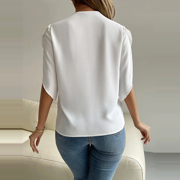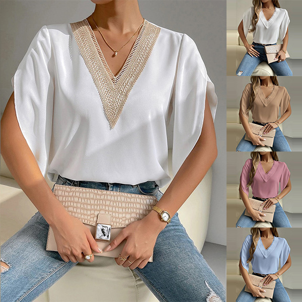 This shirt features lace splcied along the V-neck, which adds a touch of elegance and sophistication to the overall look. Multi-color avaible.
