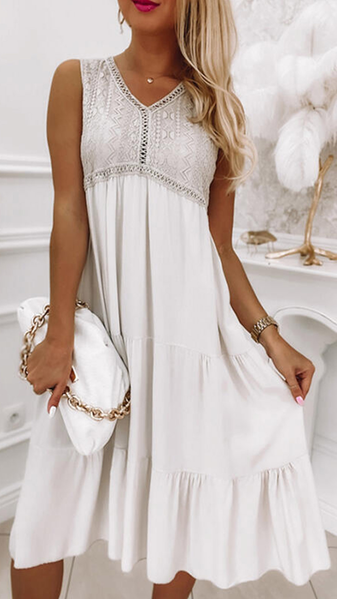 How about this dress? The lace spliced bodice add some chic element to this dress. It has a V-neck, sleeveless, tiered skirt create a flattering and feminine silhouette. wanna have one?