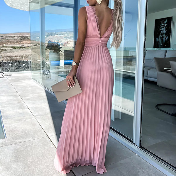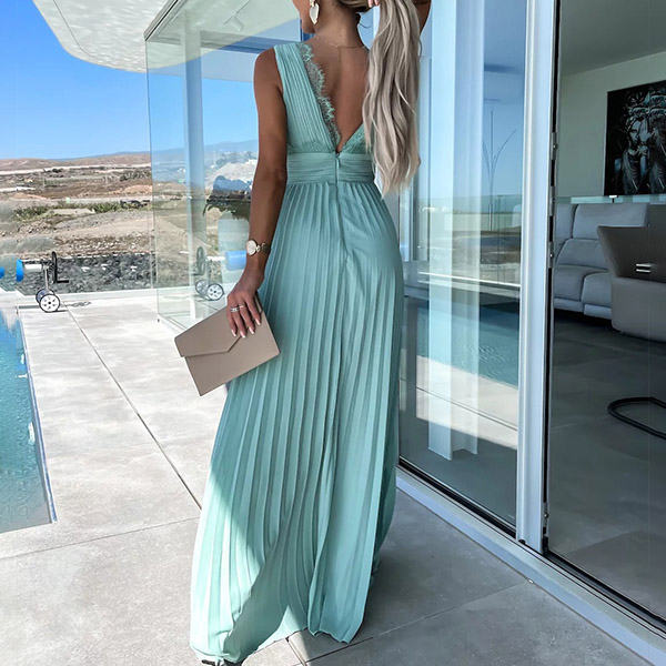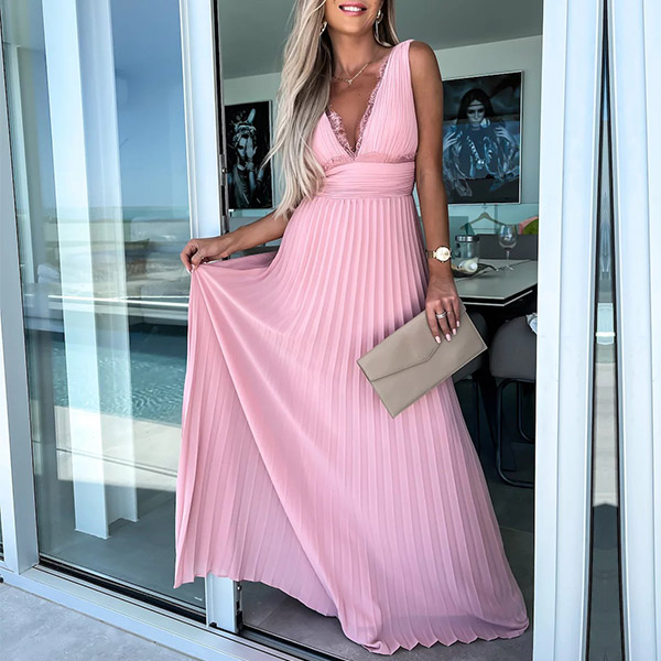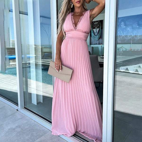 Fashion Lace Spliced V-neck Sleeveless Pleated Maxi Dress