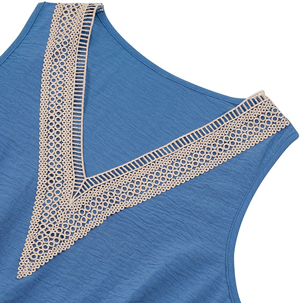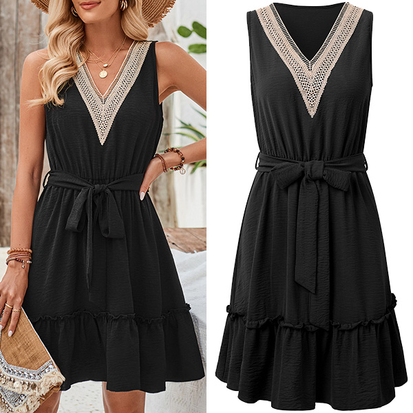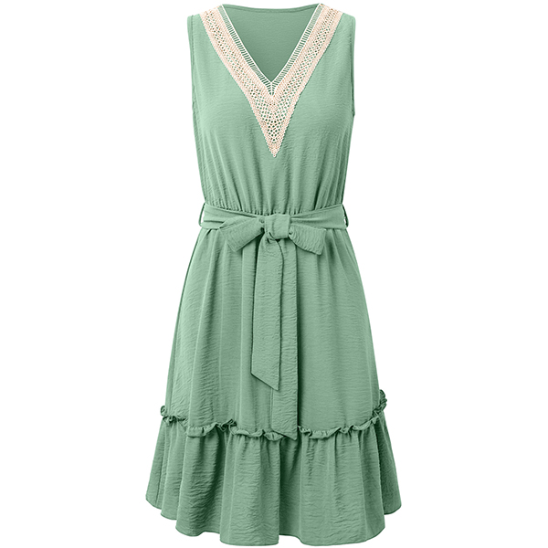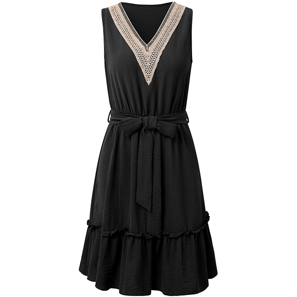 This mini dress features a lace spliced details along the V-neckline, sleeveless design, self-tie waist straps, and tiered layers for a fashionable and romantic look. Pair it with heels or sandals for a romantic and chic ensemble.
