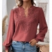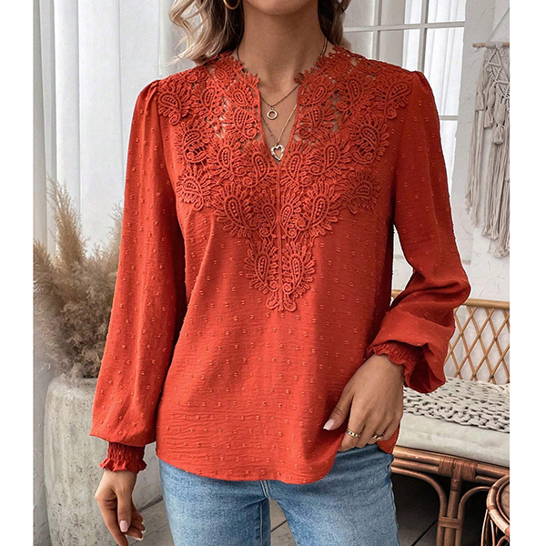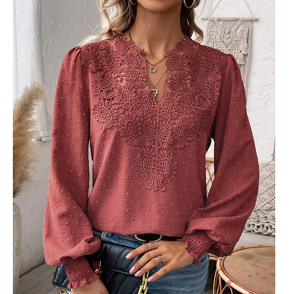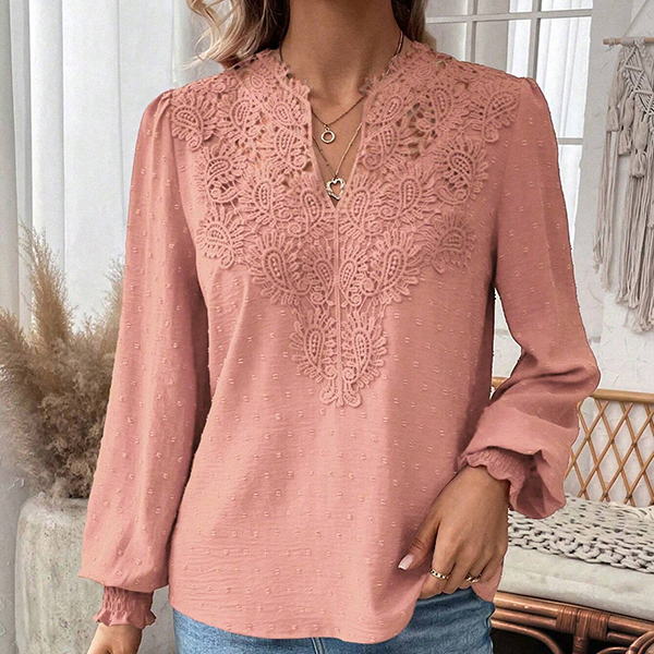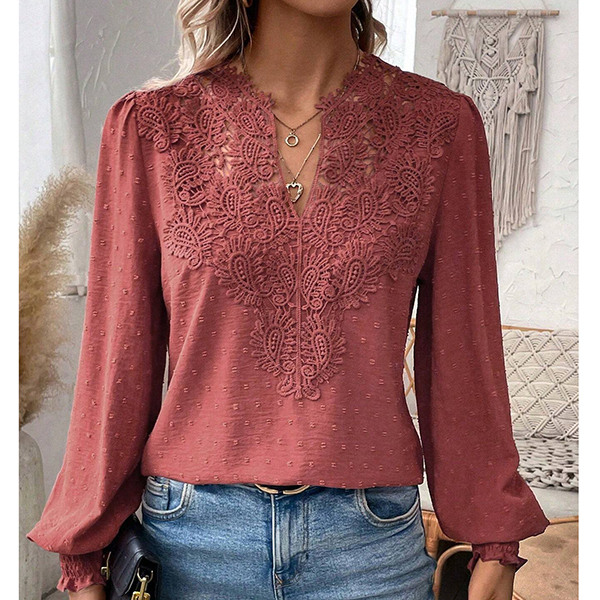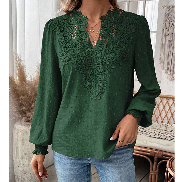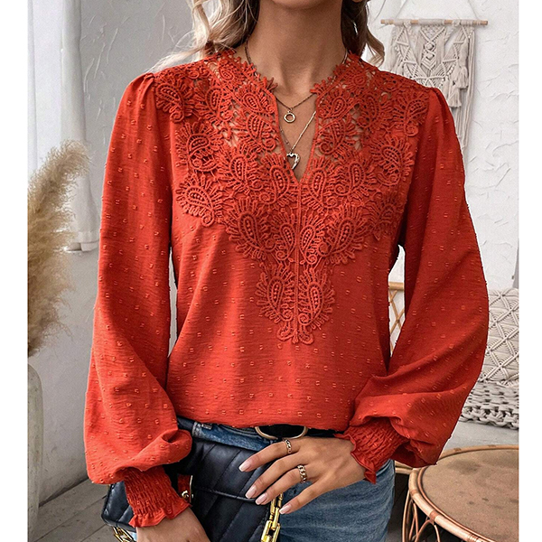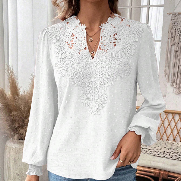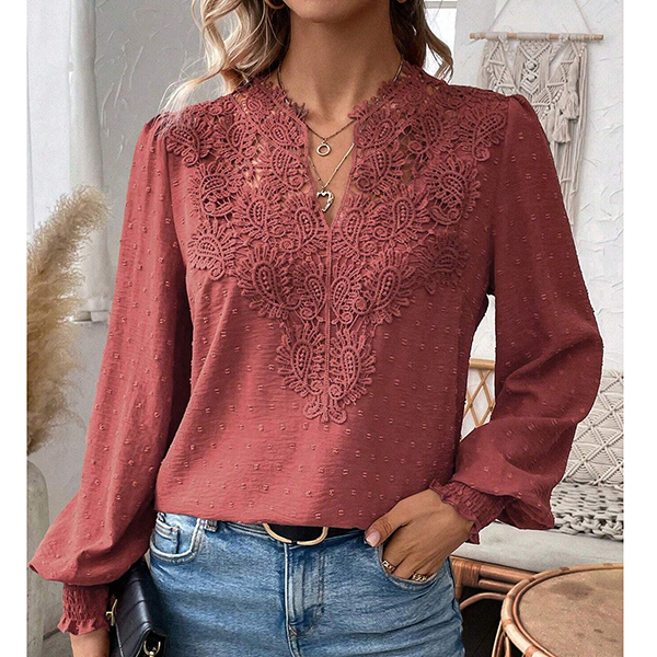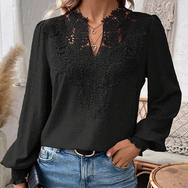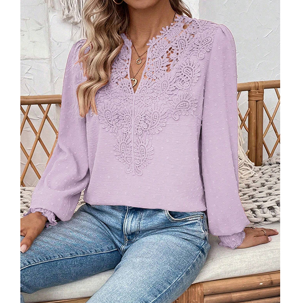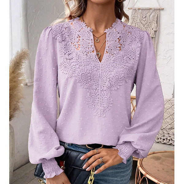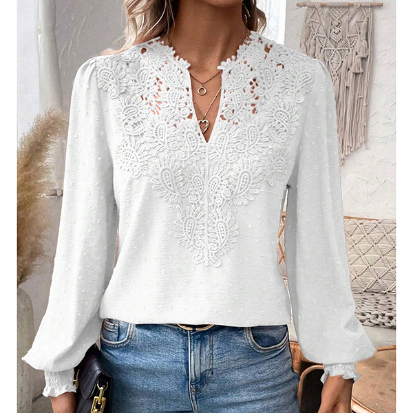 Discover romantic sophistication with this exquisitely detailed shirt that masterfully combines multiple feminine textures for truly enchanting appeal. The flattering V-neckline creates an elegant frame that enhances your décolletage while maintaining refined grace, beautifully complemented by the delicate lace splicing that adds luxurious texture and artisanal charm throughout the design. Wanna have a try?