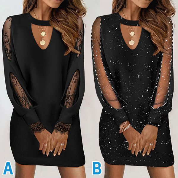 The feature of this dress is the lace spliced/gauze spliced and cutout details along the long seelve! The front cut-out design adds a hint of allure and creates a focal point, drawing attention to your neckline and adding a modern twist to the classic round neck silhouette. A and B, which one do you like?
