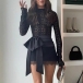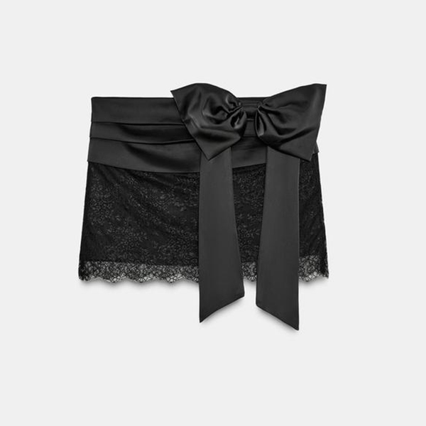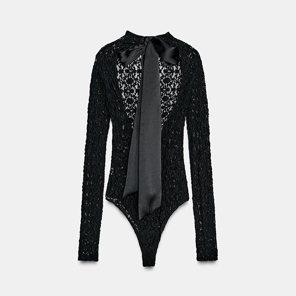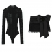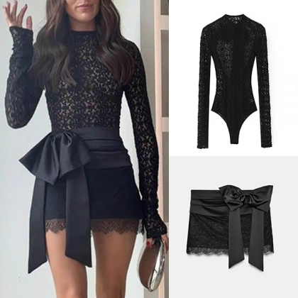 This two-piece set features romantic semi-sheer lace bodysuit with striking backless design paired with charming bowknot mini skirt for contemporary feminine sophistication. Perfect for romantic occasions, date night styling, or contemporary feminine wear.