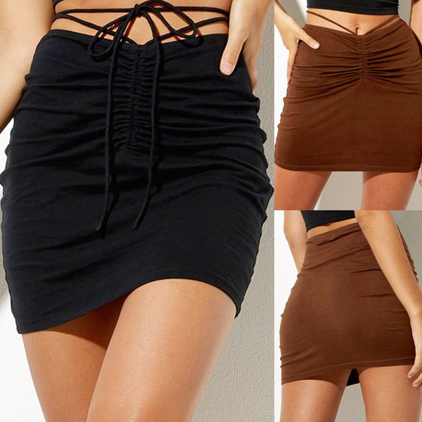 Fashion Lace-up High Waist Solid Color Slim Fit Wrinkled Skirt