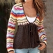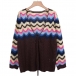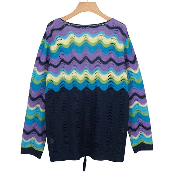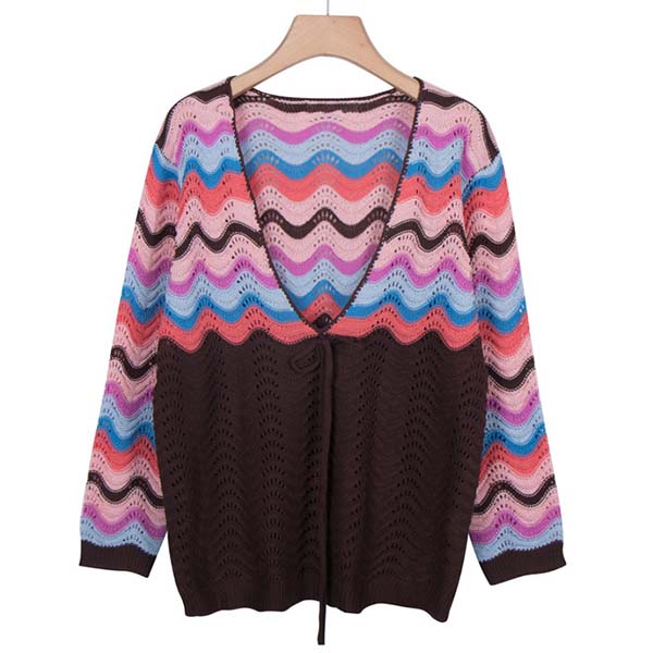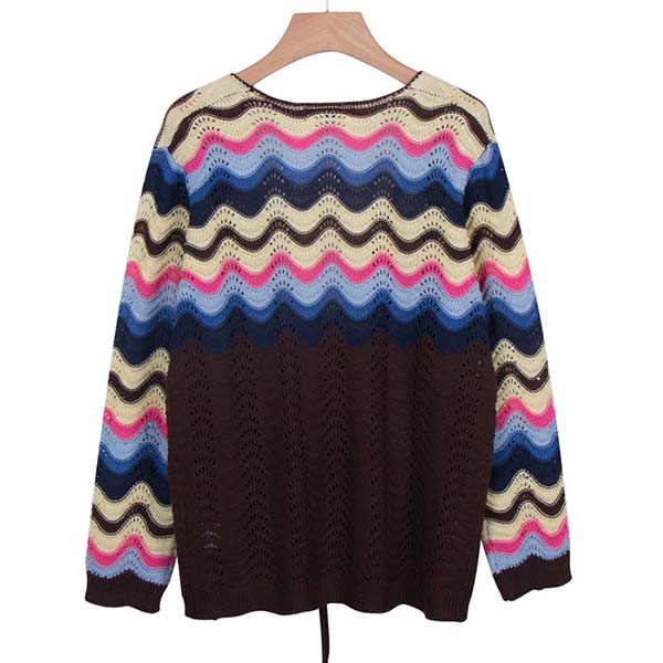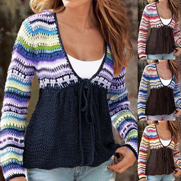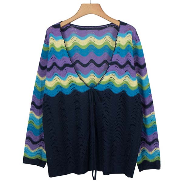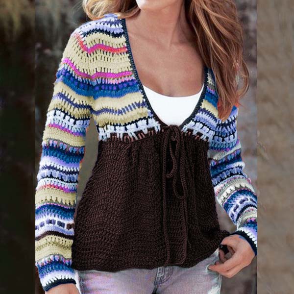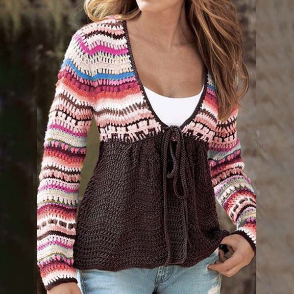 When the days get a little cold,this knit top can be a good choice. The lace-up v-neck design and colorful element design make this piece look more eye-catching. If you like it,then why not flaunt off your personality through this piece?