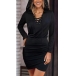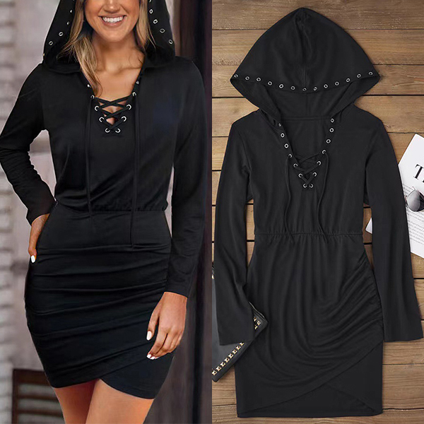Fashion Lace-up V-neck Long Sleeve Irregular Hemline Bodycon Hooded Black Dress