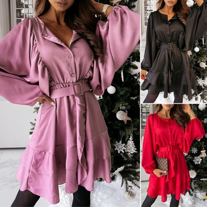 Fashion Lantern Sleeve Round Neck Ruffle Hem Solid Color Dress
