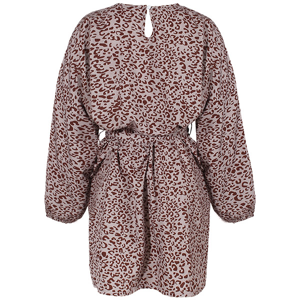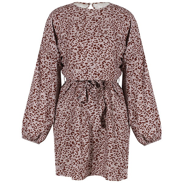 Fashion Lantern Sleeve Round Neck Tie-belt Leopard Printed Dress
