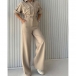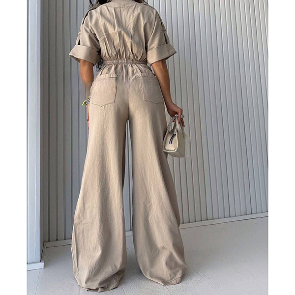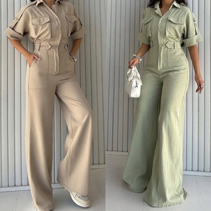 Fashion Lapel Collar Front Button Short Sleeve High-rise Straight-cut Cargo Jumpsuit