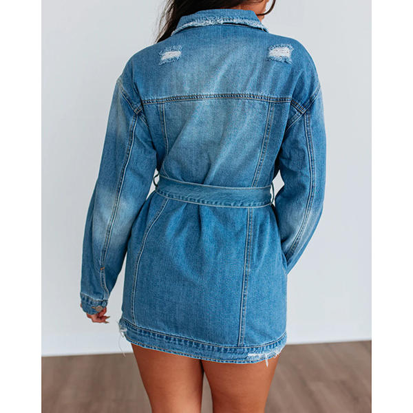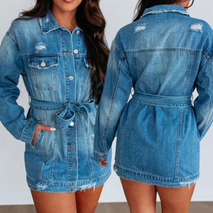 Fashion Lapel Collar Long Sleeve Front Button Distreeted Self-tie Old-washed Denim Dress