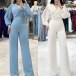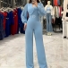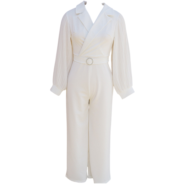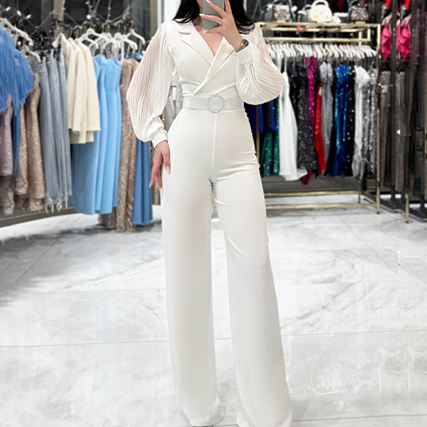 This Straight-cut Jumpsuit with Belt is a sophisticated and stylish one-piece outfit that combines elegance with modern design elements. The lapel V-neck design offers a chic and flattering neckline, adding a touch of sophistication to the jumpsuit. The chiffon spliced detailing along the long sleeve creates a delicate and feminine look, adding a light and airy feel to the outfit. The straight-cut silhouette offers a sleek and streamlined look, creating a polished and refined appearance. Perfect for this season~