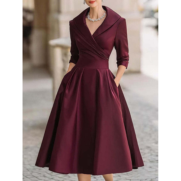 An elegant dress! The sophisticated lapel collar and flattering V-neckline create a refined, elegant frame that elevates the entire silhouette. Elbow-length sleeves offer the perfect balance of coverage and breathability, making this dress ideal for transitional seasons. A high-rise waistline defines your figure beautifully while the midi length provides graceful, timeless elegance. Practical side pockets add everyday functionality without compromising the dress's sleek lines—because style should never mean sacrificing convenience. Hope you like it.
