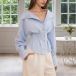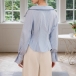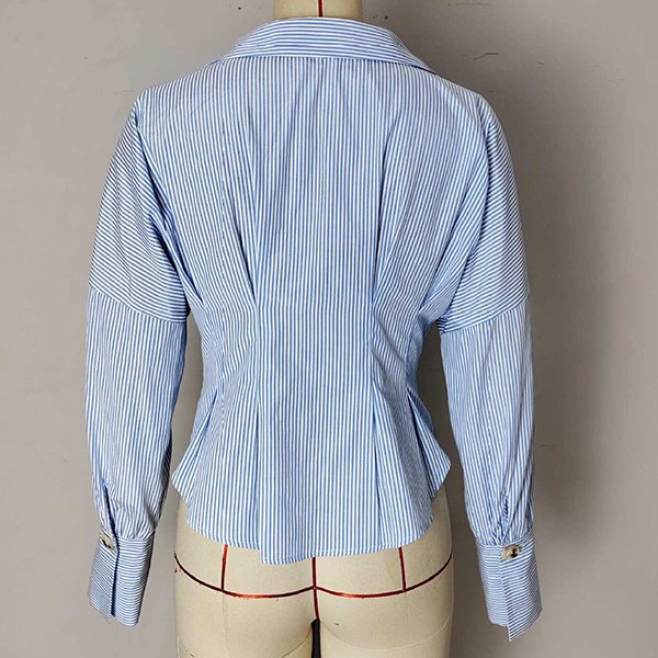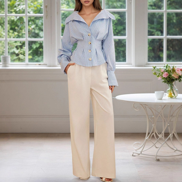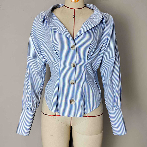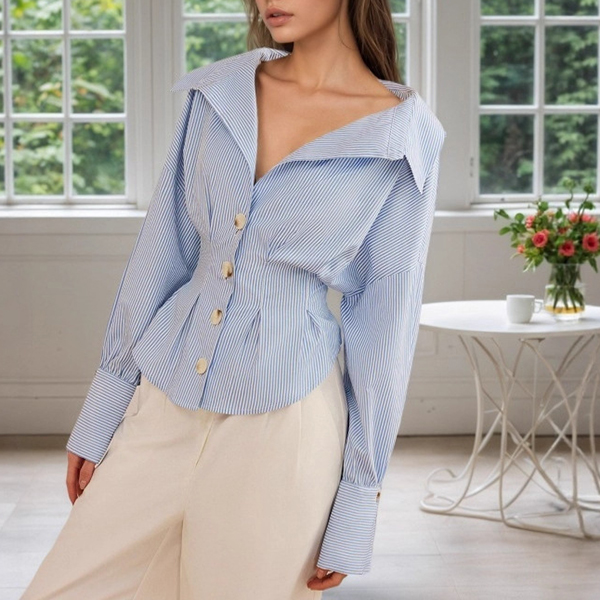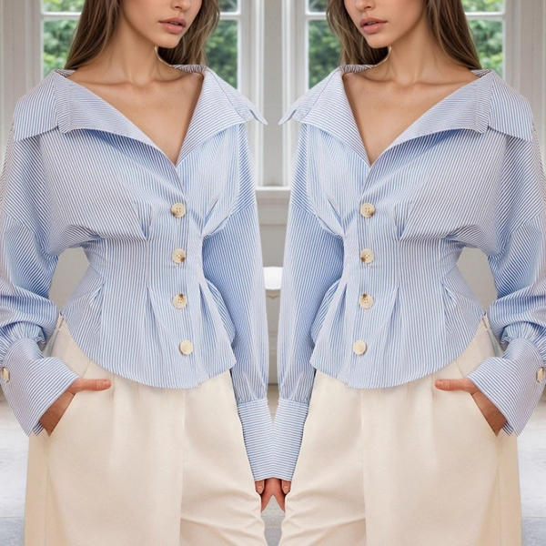 Look at this shirt! The structured lapel adds chic sophistication while the flattering V-neckline creates a graceful, elongating effect that beautifully balances the tailored elements with feminine charm. The defining feature of this blouse is the cinched waist detail that transforms the traditional button-down silhouette into a figure-flattering masterpiece. This versatile piece works beautifully tucked into tailored trousers or pencil skirts for classic office sophistication, or can be styled with wide-leg pants for contemporary professional elegance.