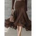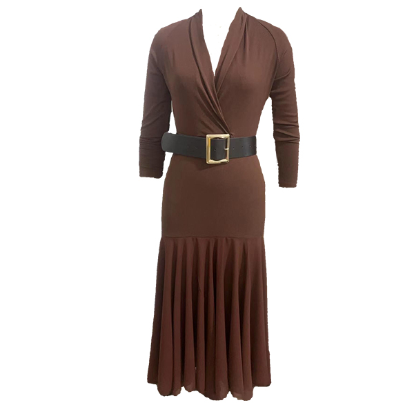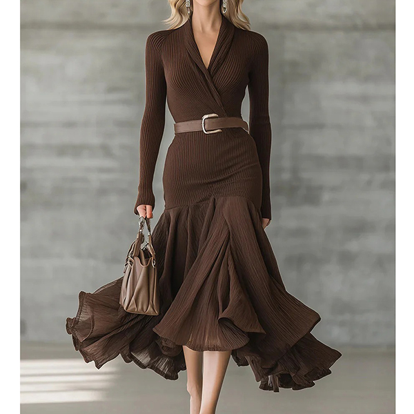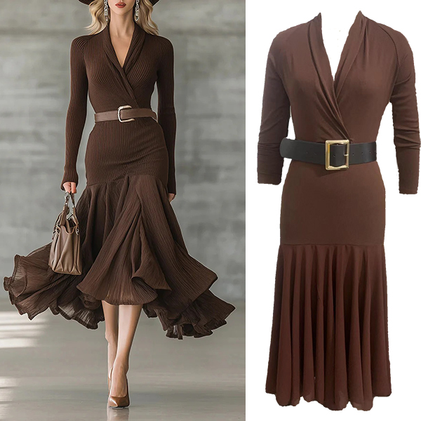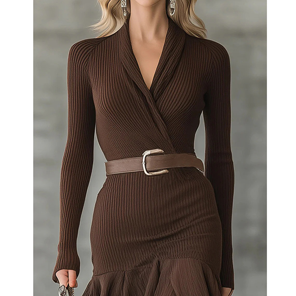 Fashion Lapel V-neck Long Sleeve Ruffle Hemline Midi Dress (without Belt)