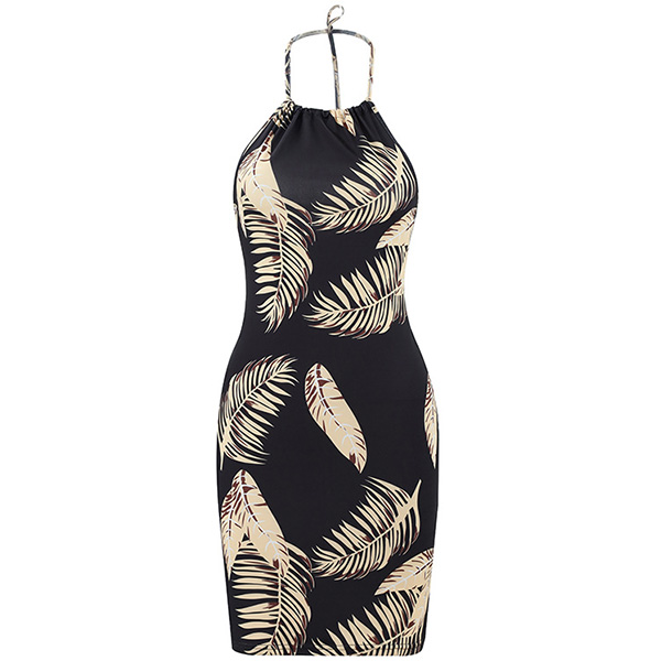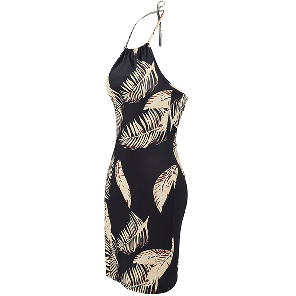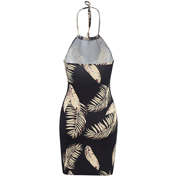 Fashion Leaves Printed Backless Halterneck Bodycon Dress