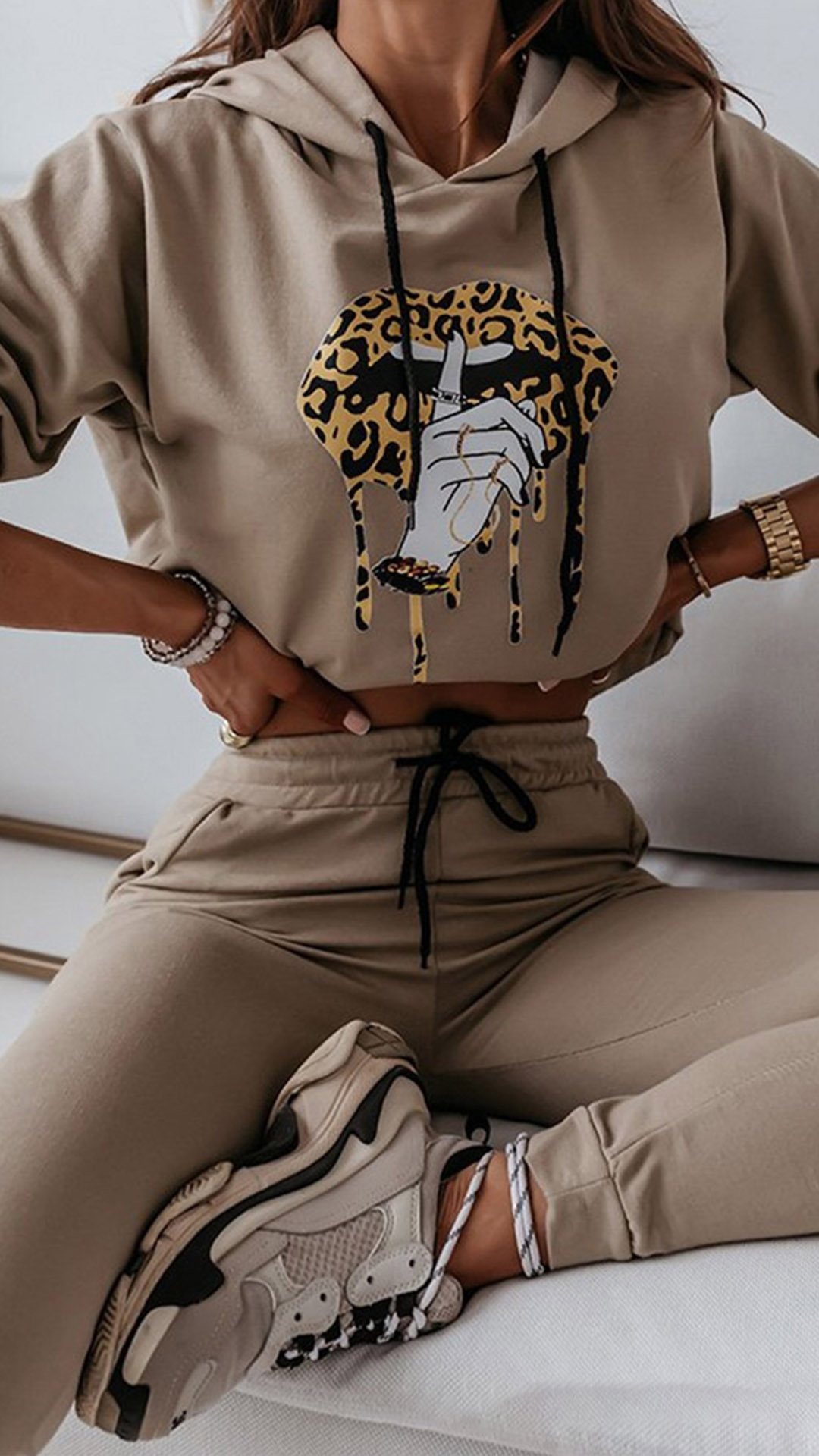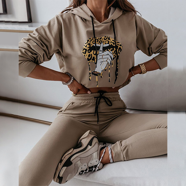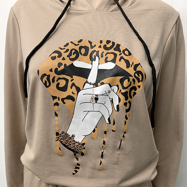 When the weekends hit,you can just slip into this two-piece set to have a relaxed yet fashionable style. It consists of a long sleeve hooded sweatshirt and a pants,crafted from soft and breathable fabric,this two-piece set can give you an all-day comfort. Moreover,the leopard lip pattern design will make it look more attractive and eye-catching. Also perfect fit for your sports time.