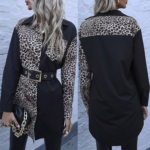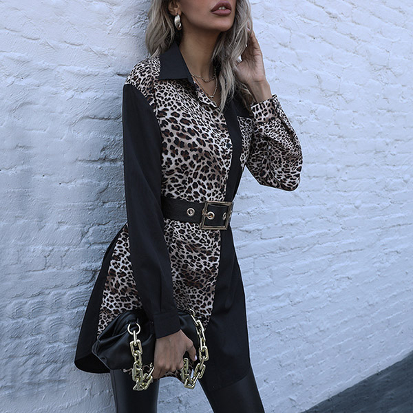 Fashion Leopard Print Contrast Color Stand Collar Long Sleeve Shirt Without Belt