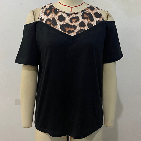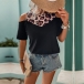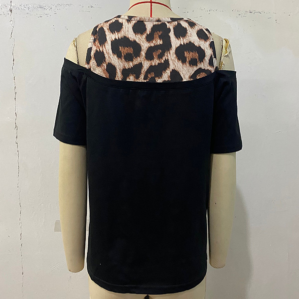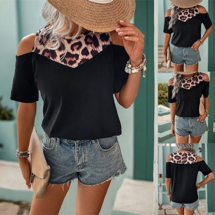 Fashion Leopard Print Round Neck Open Shoulder Short Sleeve Shirt