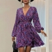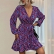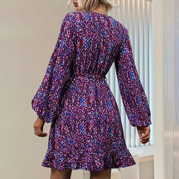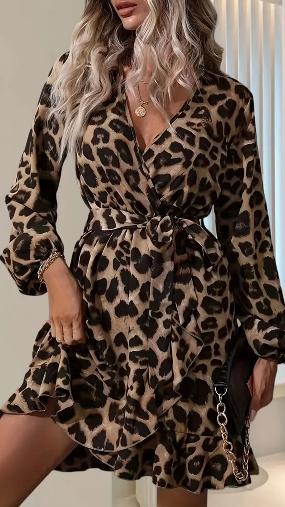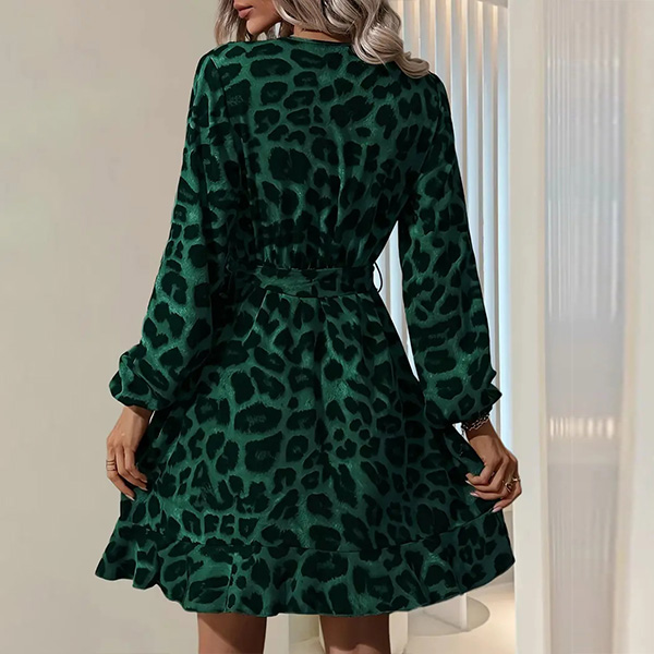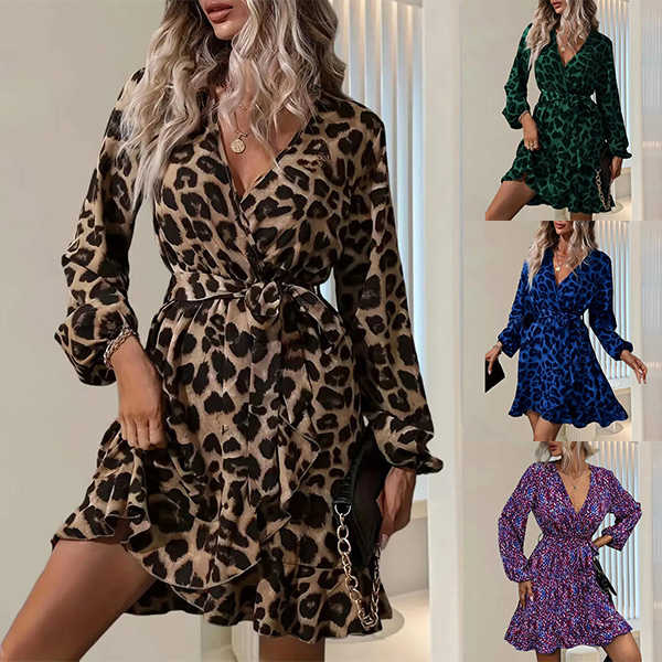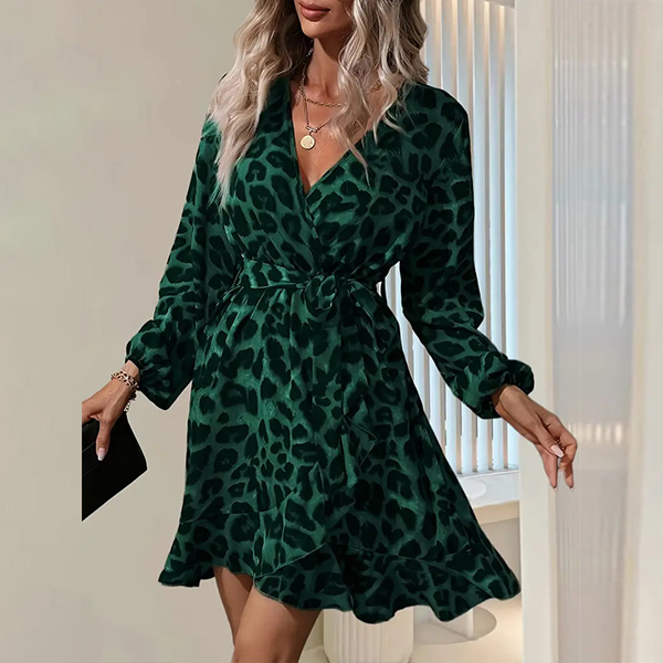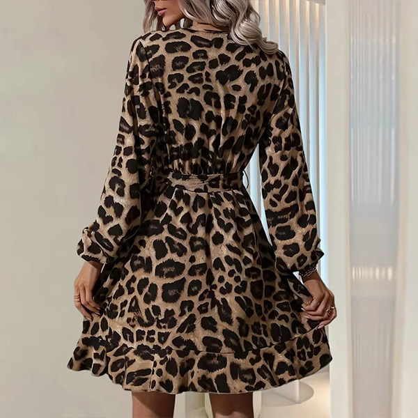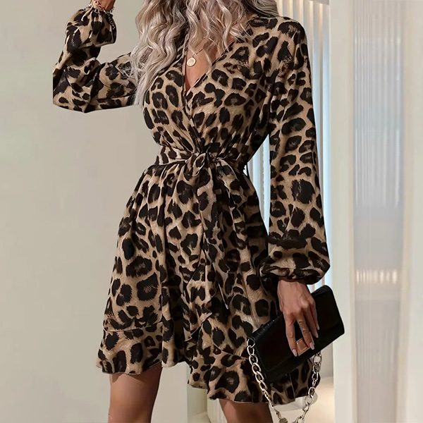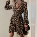 Fashion Leopard Print V-neck Long Sleeve Self-tie Mini Dress