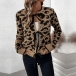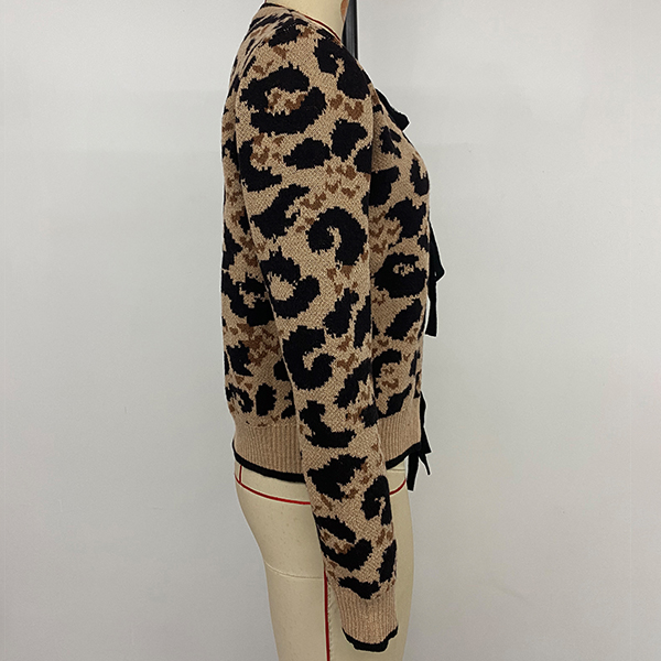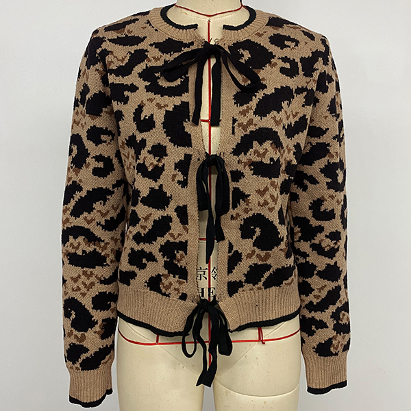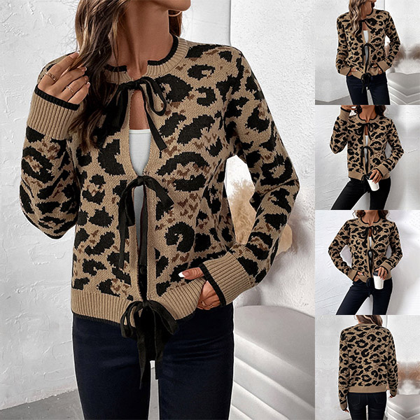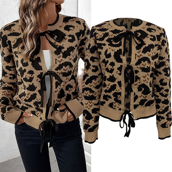 Fashion Leopard Printed Crew Neck Long Sleeve Front Bowknot Cardigan