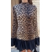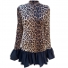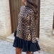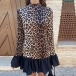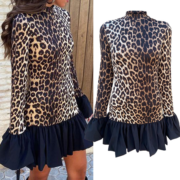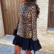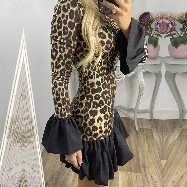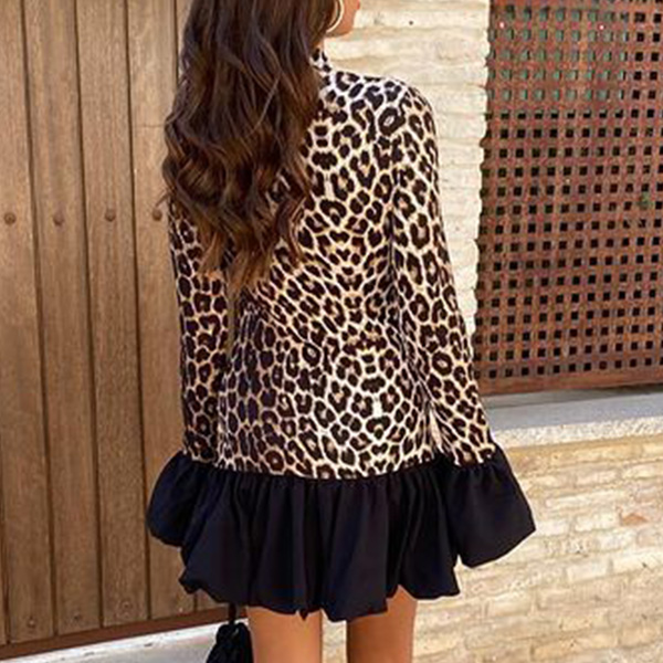 Fashion Leopard Printed Long Sleeve Ruffle Hemline Mini Dress