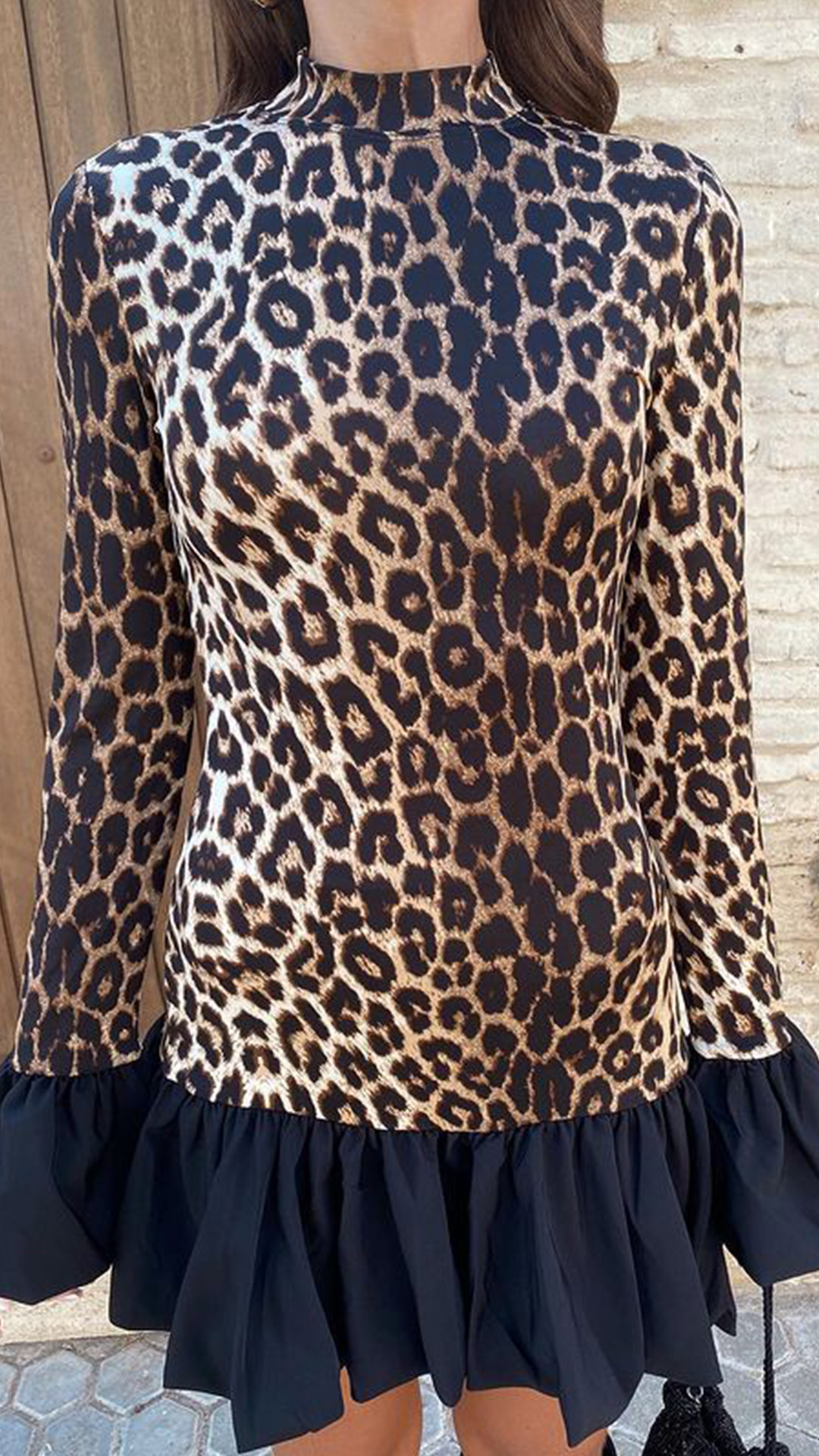 Make a bold statement with this Mini Dress. This trendy dress features a striking leopard print design that exudes confidence and style. The ruffle design along the cuff and hemline creates a flirty and feminine silhouette. Pair it with boots for a more casual vibe.