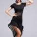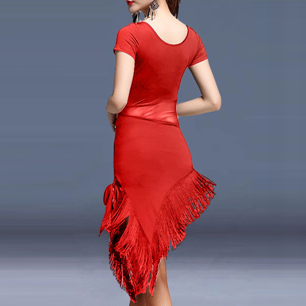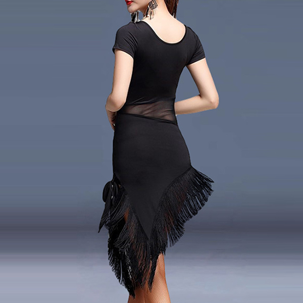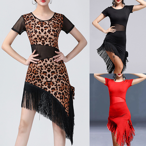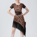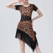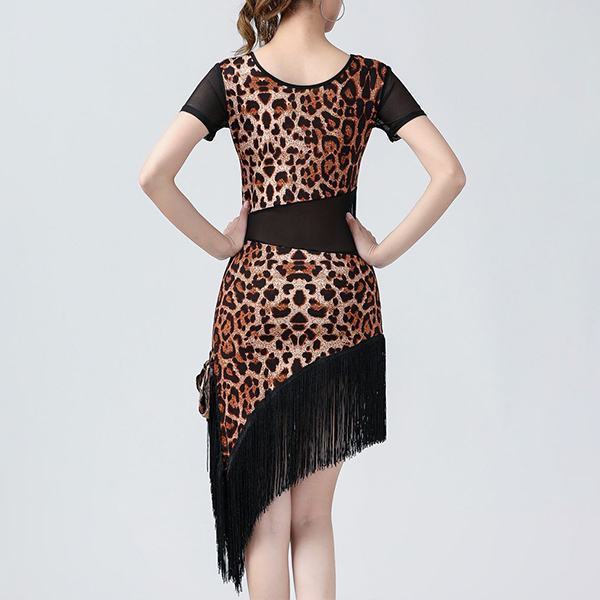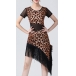 Fashion Leopard Printed Round Neck Short Sleeve Gauze Spliced Tassel Irregular Hemline Dancing Dress