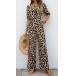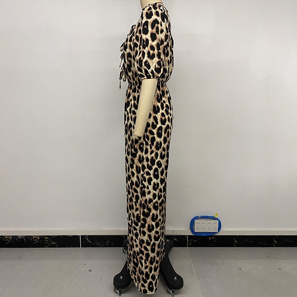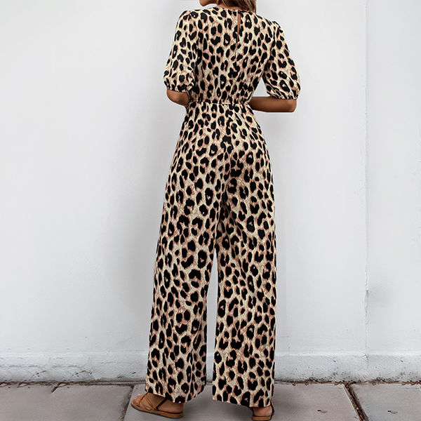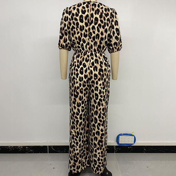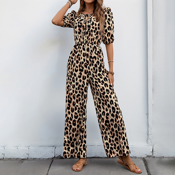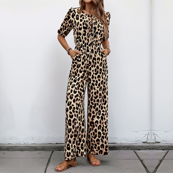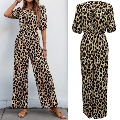 Fashion Leopard Printed Self-tie Crew Neck Short Sleeve High-rise Jumpsuit