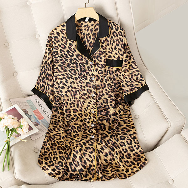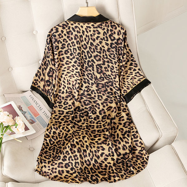 For your home time an sleeping time,this nightwear dress can easily strike your mind. The leopard printed details make this piece look so eye-catching. Finished with short sleeve,notched lapel,single-breasted and a loose silhouette,this dress not only can keep the comfy,but also can exude your style and personality.