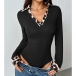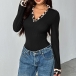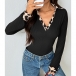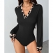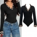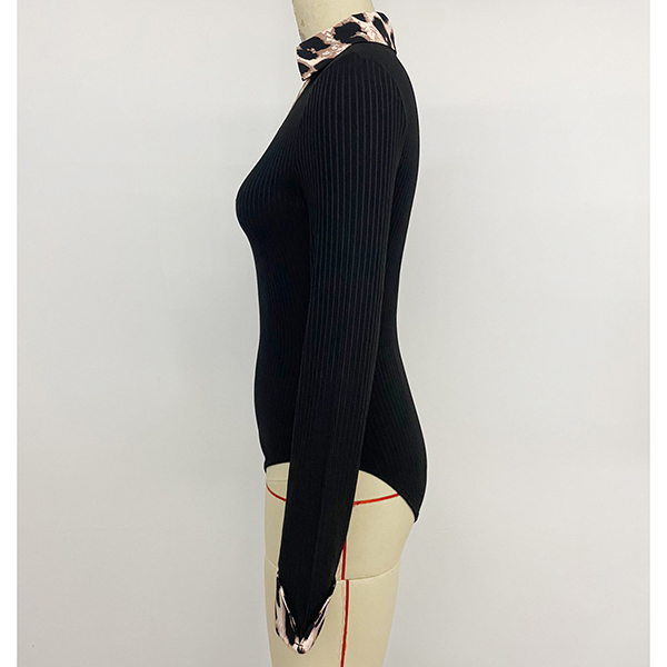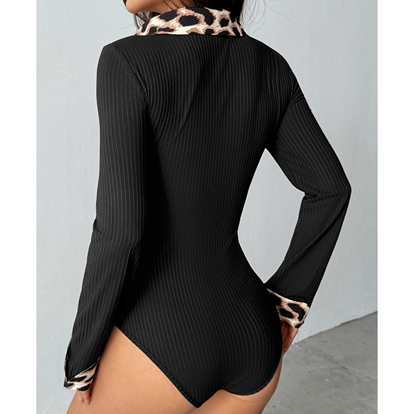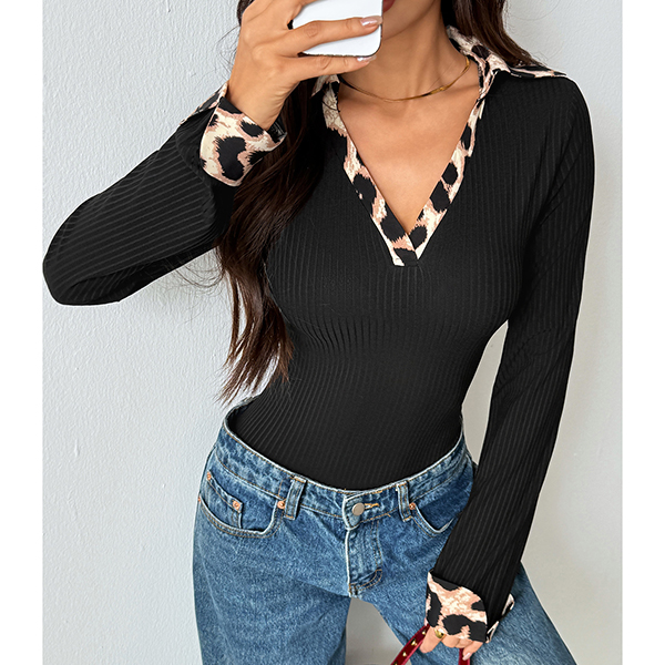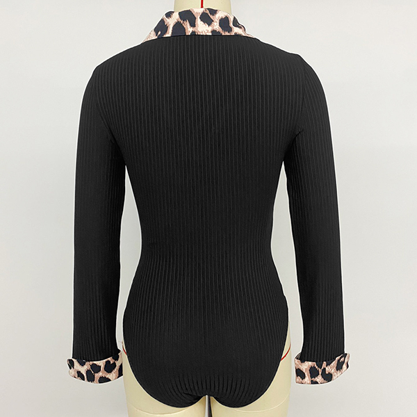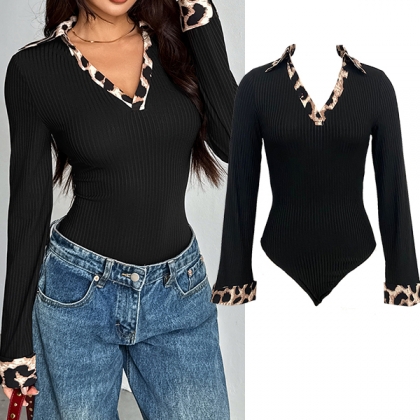 Fashion Leopard Printed Spliced Lapel Collar V-neck Long Sleeve Ribbed Bodysuit