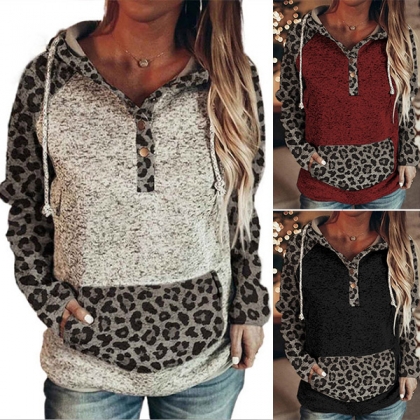 Fashion Leopard Printed Spliced Long Sleeve Hooded Sweatshirt
