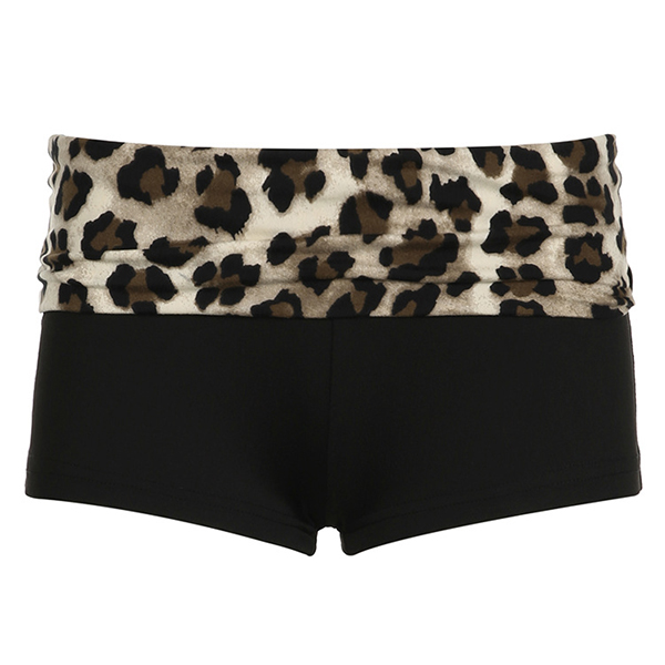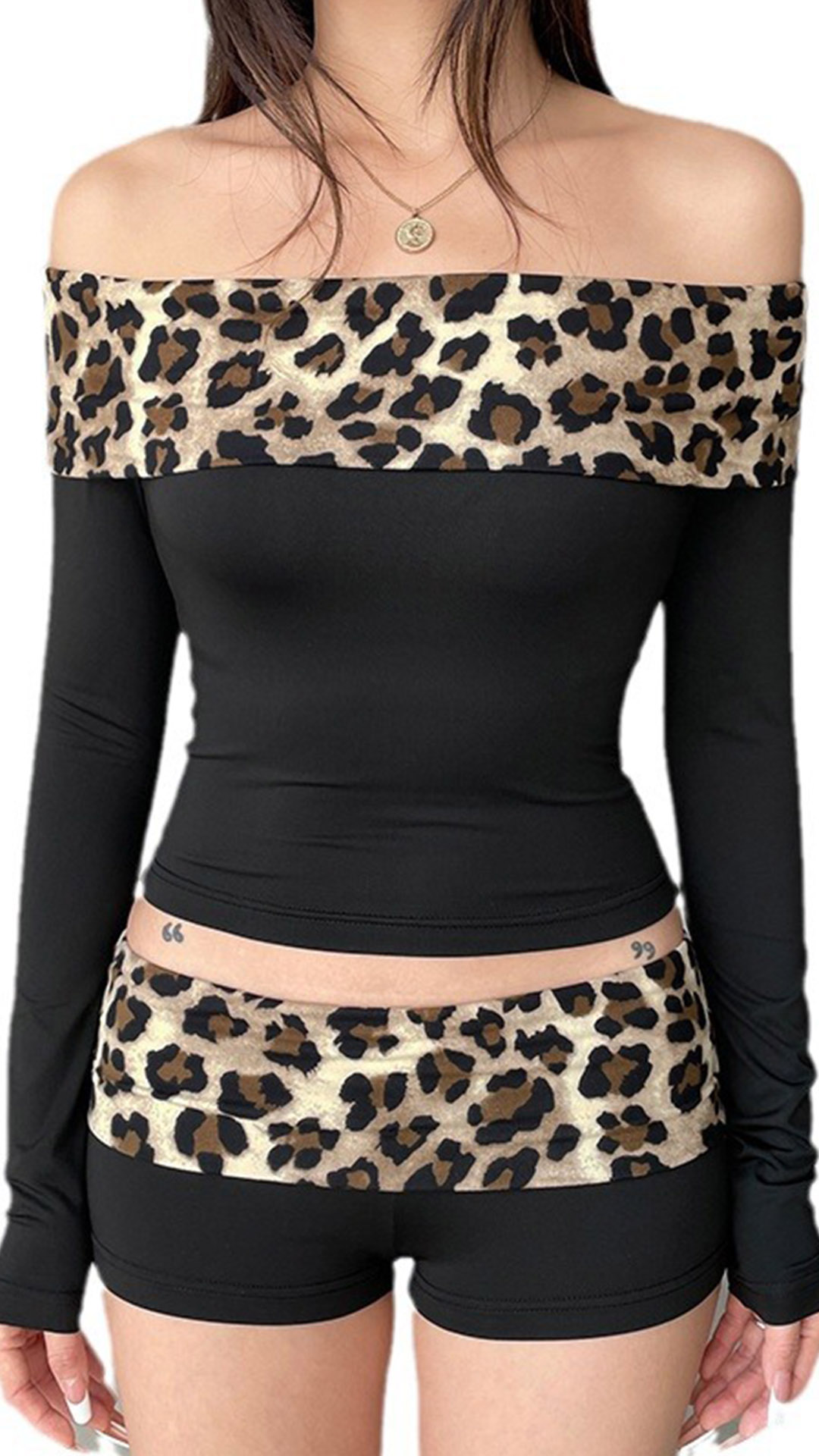 The standout feature of this set is the eye-catching leopard print spliced that adorns both the crop top and the shorts.