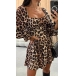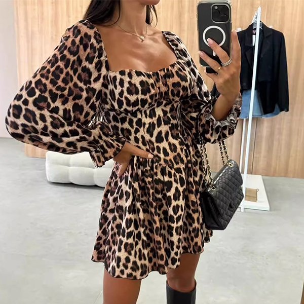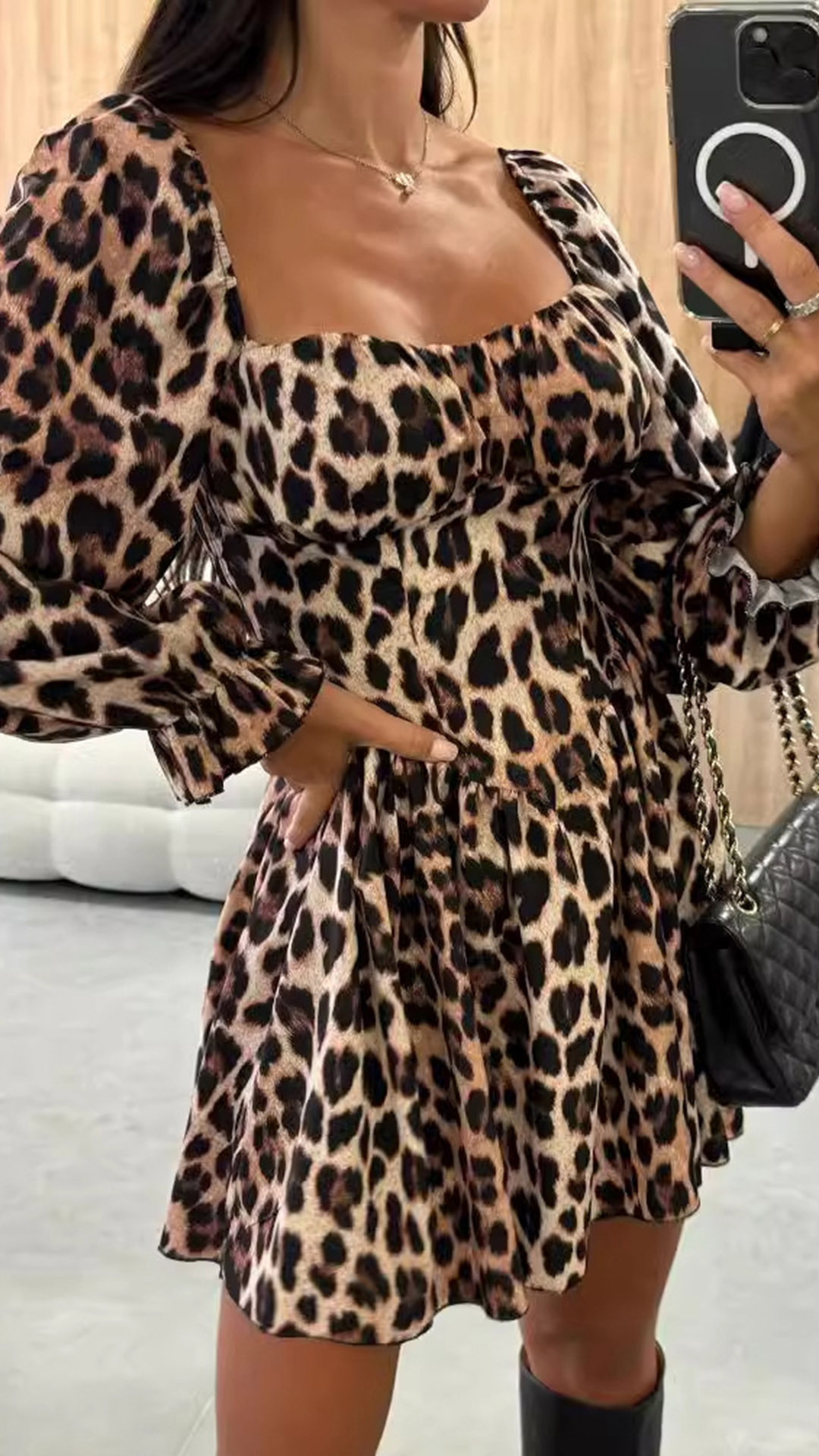 Fashion Leopard Printed Square Neck Long Sleeve Mini Dress
