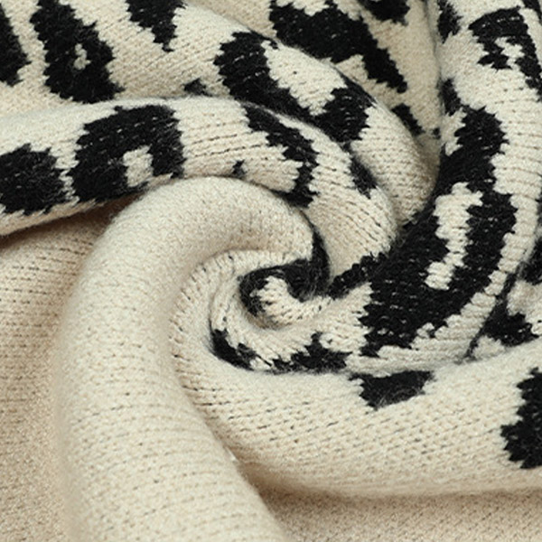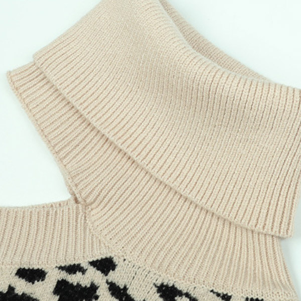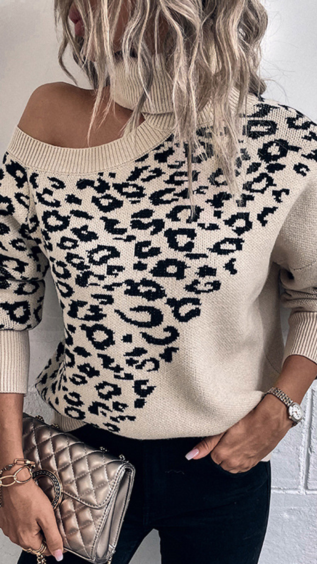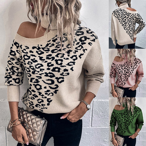 Fashion Leopard Printed Turtleneck Open Shoulder Long Sleeve Knitted Sweataer