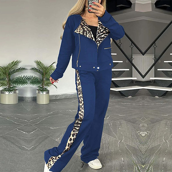 Fashion Leopard Printed Two-piece Set Consist of Crop Jacket and Straight-cut Pants